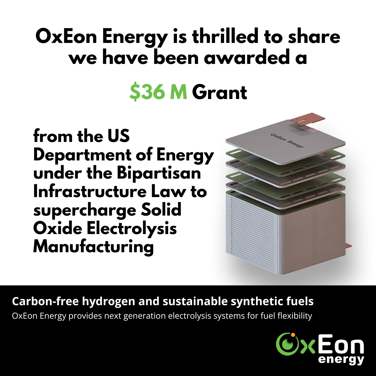 OxEon Energy has modified its solid oxide fuel cell technology to provide a stable, reliable electrolysis stack to produce hydrogen from steam electrolysis or synthesis gas (i.e. hydrogen and carbon monoxide) from water vapor (steam) and carbon dioxide co-electrolysis. The solid oxide electrolysis cell (SOEC) technology is also capable of co-producing high purity oxygen from these feedstocks.